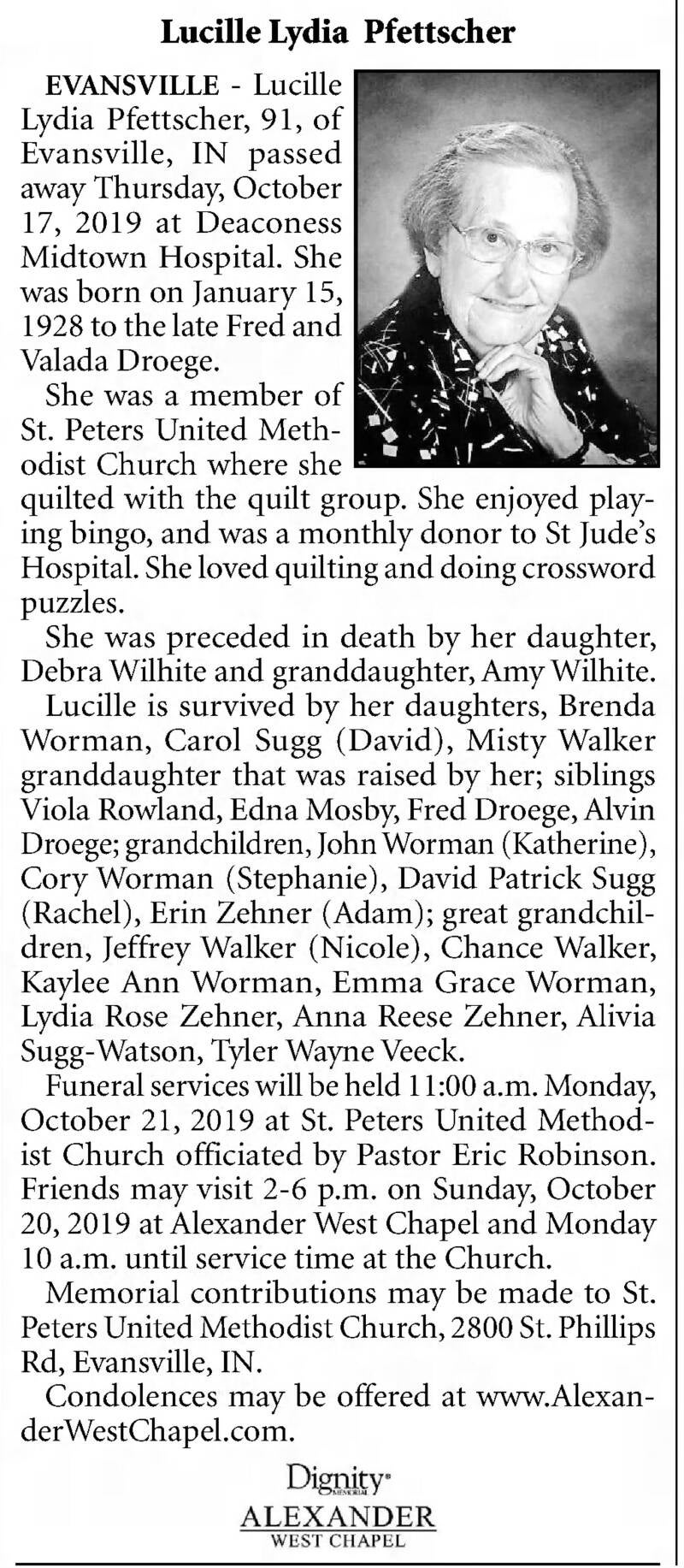 Lucille's obituary as featured in the Evansville Courier and Press, Saturday, October 19, 2019, page 4A